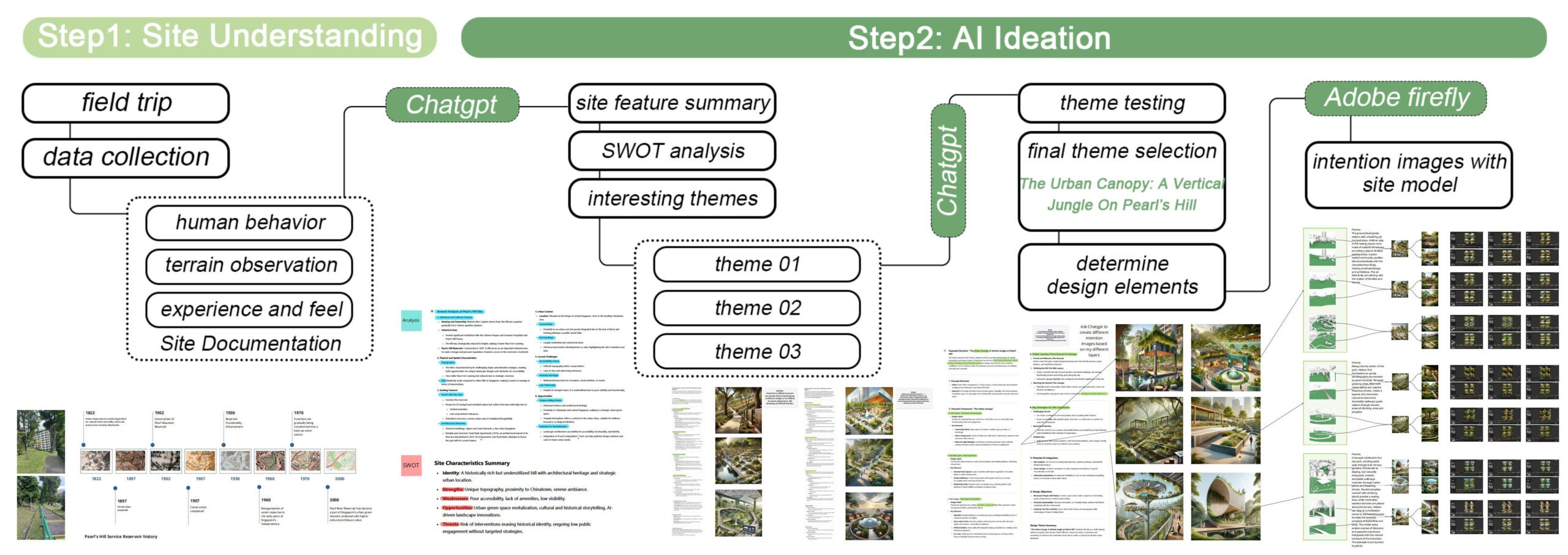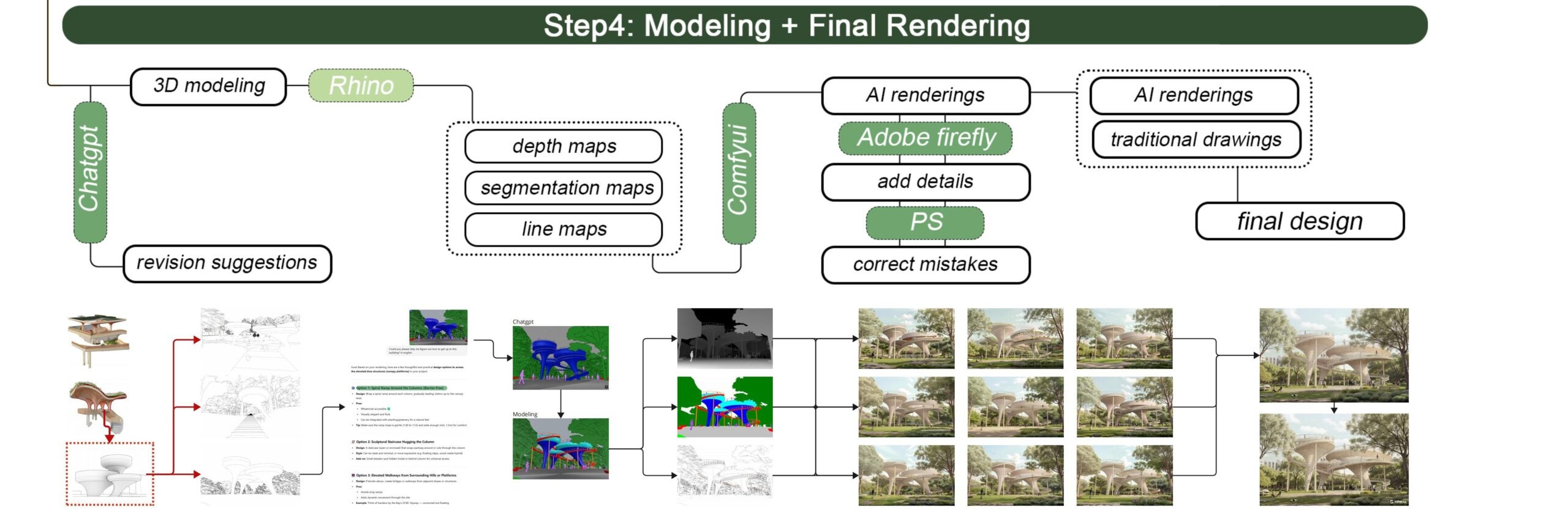 This project also serves as an exploration of AI-assisted workflows in landscape architecture, integrating tools such as ChatGPT, ComfyUI, Adobe Firefly, Photoshop, Rhino, Grasshopper and Tripo3d. AI was involved across every stage—analyzing site conditions, proposing multiple design narratives, refining conceptual ideas, and producing visual outputs. Through iterative human-machine collaboration, the project demonstrates how AI can augment creative processes, enhance visualization accuracy, and unlock unexpected design possibilities. Rather than replacing human intuition, AI acted as an active partner in expanding the imagination and bridging technical and narrative development.