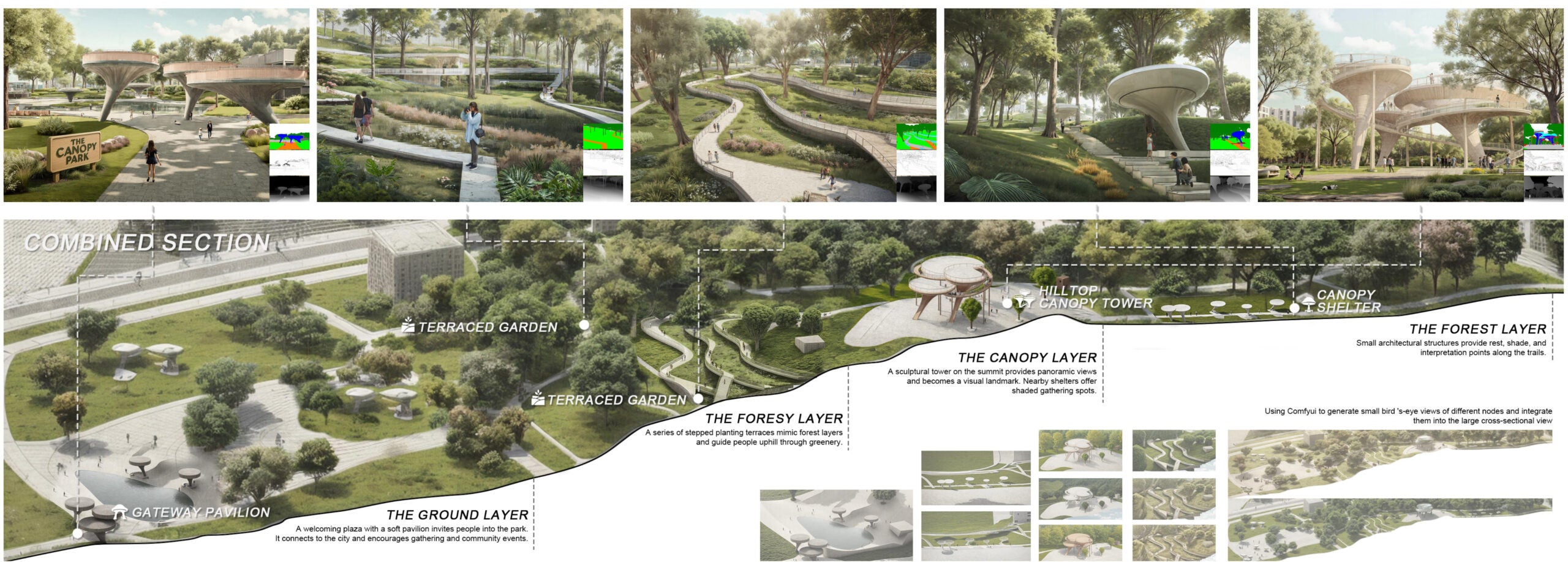 The Urban Canopy: A Vertical Jungle on Pearl’s Hill reimagines a historically yet underutilized hillside park in central Singapore. The design envisions a continuous spatial journey across three layers—the Ground, the Forest Floor, and the Canopy—where the organic language of the canopy structure weaves through the entire site. The Ground Layer provides an open plaza for community gathering and events; the Forest Layer offers terraced gardens and shaded pathways, celebrating biodiversity and promoting a slower, reflective journey uphill; the Canopy Layer culminates with a sculptural installation, allowing visitors to reach the summit and experience expansive city views. The project focuses on creating a fluid experience of gathering, exploration, and elevation, emphasizing movement through shifting landscapes and sculptural interventions. The canopy-inspired forms anchor the site’s identity, offering visual continuity and moments of pause, while respecting the site’s topography and scale.