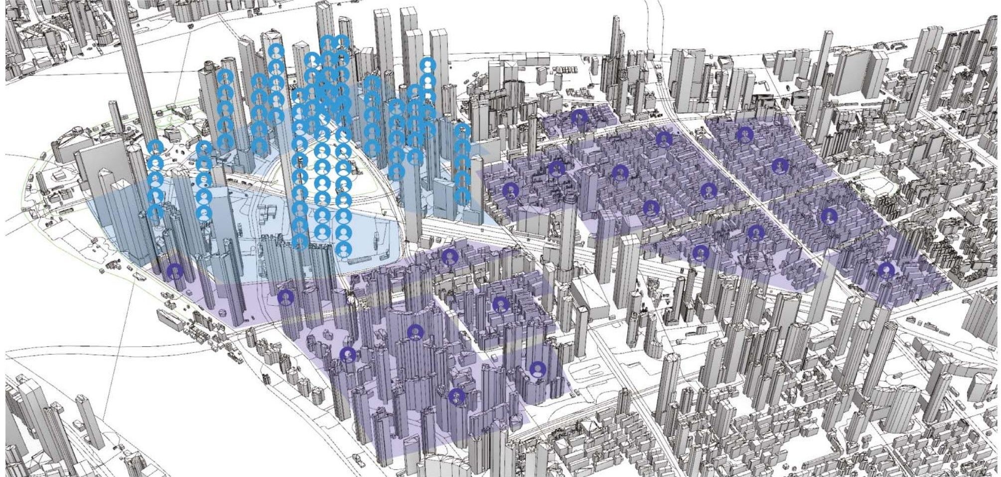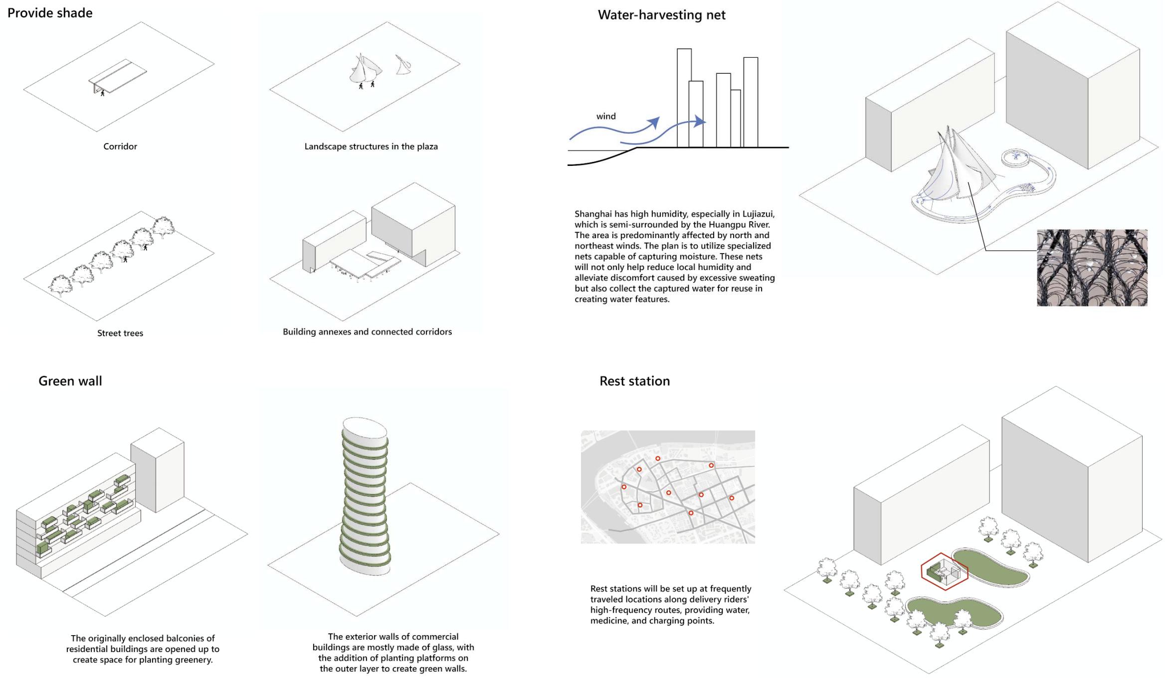 This project focuses on the real-life delivery routes and working conditions of food delivery workers in Lujiazui, Shanghai. By closely examining their daily routines, movement patterns, and the environmental challenges they face—particularly those related to extreme heat and urban microclimates—the study seeks to propose targeted optimisations to the current delivery system. In order to enhance the safety, comfort, and efficiency of their working environment, the project rethinks and redesigns outdoor spaces such as streets, sidewalks, and rest points through a people-centred and climate-responsive lens.