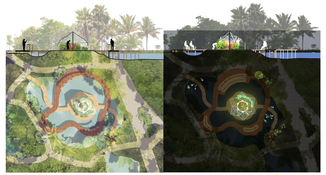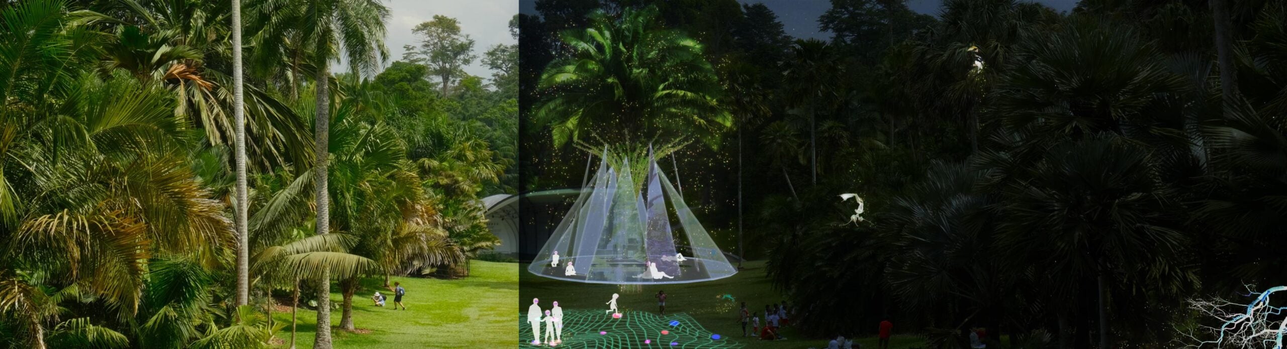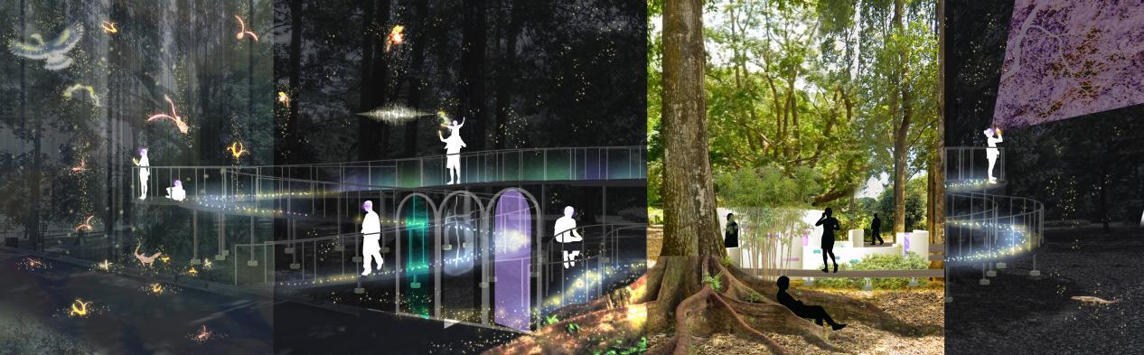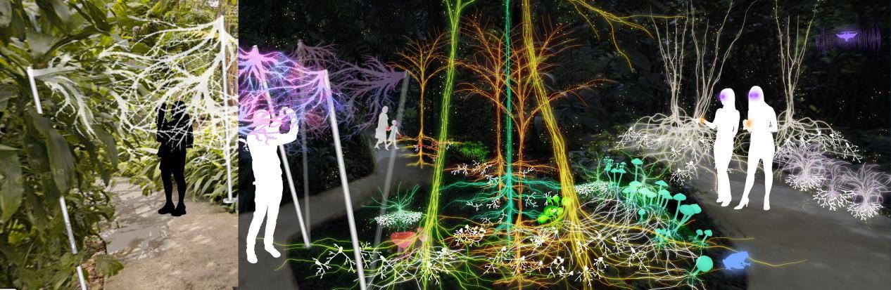 The journey begins at the ecological collapse. As visitors move through my designed landscape, guided by AR glasses, bio-bracelets, and neural headsets, they rediscover nature’s resilience. They encounter sprawling networks of mycelium, gene-edited plants flourishing into spectacular forms, and mast-fruiting trees synchronized to algorithmic rhythms.