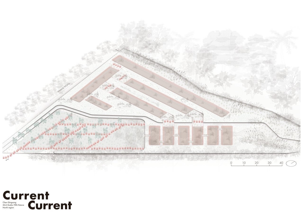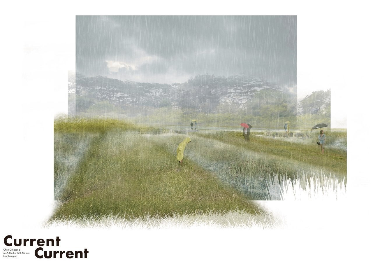Current Current amplifies the agency of on-site runoff, transforming the grassland within the former Kranji Army Barracks Reserve Site into an enclosed garden for runoff. The grassland is surrounded by layered traces of historical human activity and the 4 nature narrative of the nation. As the surrounding dense tropical forest around the site lacks ground cover, allowing runoff to freely pool and flow across the site. The temporary runoff exhibits emergent agency through processes of flow and stagnation, and continually sculpts the site’s present landform and ecology. The footprints of the runoff overlap with each rainfall, revealing the layers of the past while also sculpting the future ground.