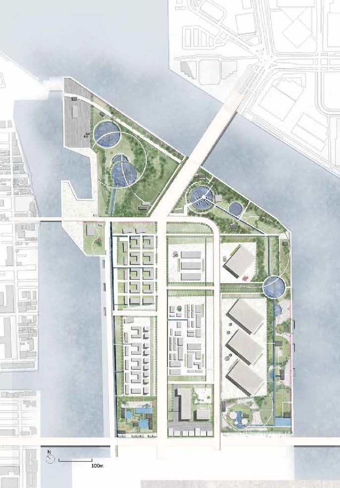 The Waters of Renewal project revives the identity and cultural heritage of water in Harumi, Tokyo. It draws a connection from Tsukiji and Tsukishima to create a holistic water-centric urban experience. The project is focused on intentional use of water for identity, to guide its environmental strategy, and an increase in residential density. It is a new urban island by the water. The project features water features such as open cleansing ponds, landform parks, water parks and hot springs will serve as a communal space, fostering social engagement and well-being.
