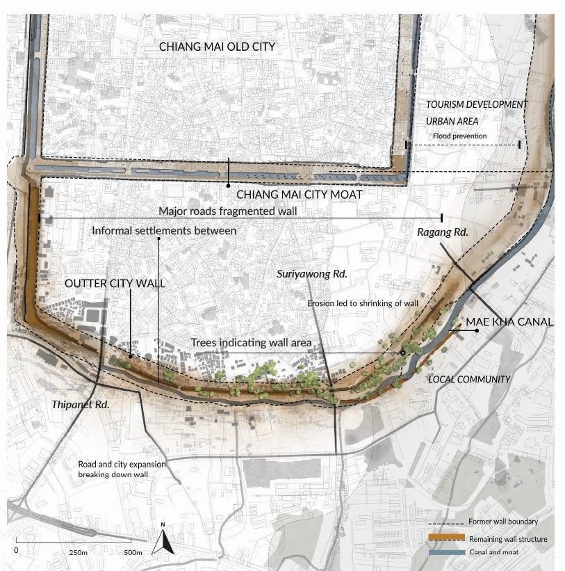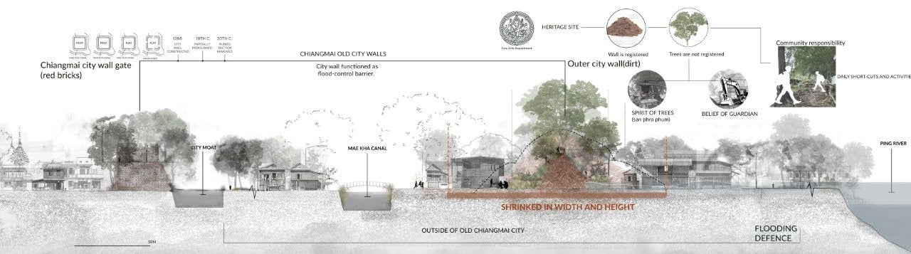 This project rethinks heritage conservation through the living landscape of Chiang Mai, focusing on the gradually eroding outer city wall. Rather than treating heritage as a static object, the project understands it as a dynamic layer of memory, continuously shaped by ecological processes, community practices, and material change. It responds to the limitations of state-led conservation by proposing alternative strategies that foreground local stewardship, informal land use, and the agency of non-human systems.