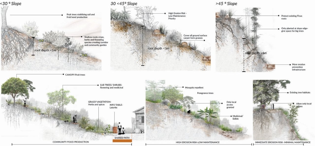 In response, the project proposes a ‘communal-ecological heritage corridor’ that integrates conservation with everyday use. The strategy is organised across slope gradients, combining erosion control with productive planting and habitat formation. Gentle slopes are transformed into shared cultivation spaces for herbs, vegetables, and fruit trees, fostering collective stewardship. Steeper slopes prioritise soil stabilisation through layered planting systems that also support small-scale harvesting and biodiversity. The most vulnerable areas focus on immediate erosion control, preserving existing vegetation and introducing deep-rooted species alongside lightweight timber and bamboo structures.