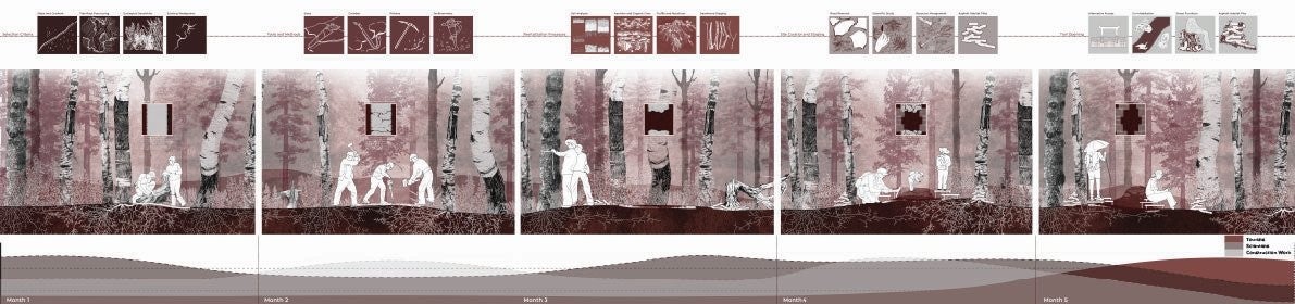 The design responds by shifting attention from outward-facing tourism infrastructure to inward ecological processes. Central to the proposal is the slow removal of the existing asphalt road, originally built for royal access, over a five-month period. This gradual process allows for soil recovery, material reuse, and the observation of ecological succession. Fragments of asphalt are retained as markers of the site’s layered history, transforming infrastructure into a pedagogical tool.