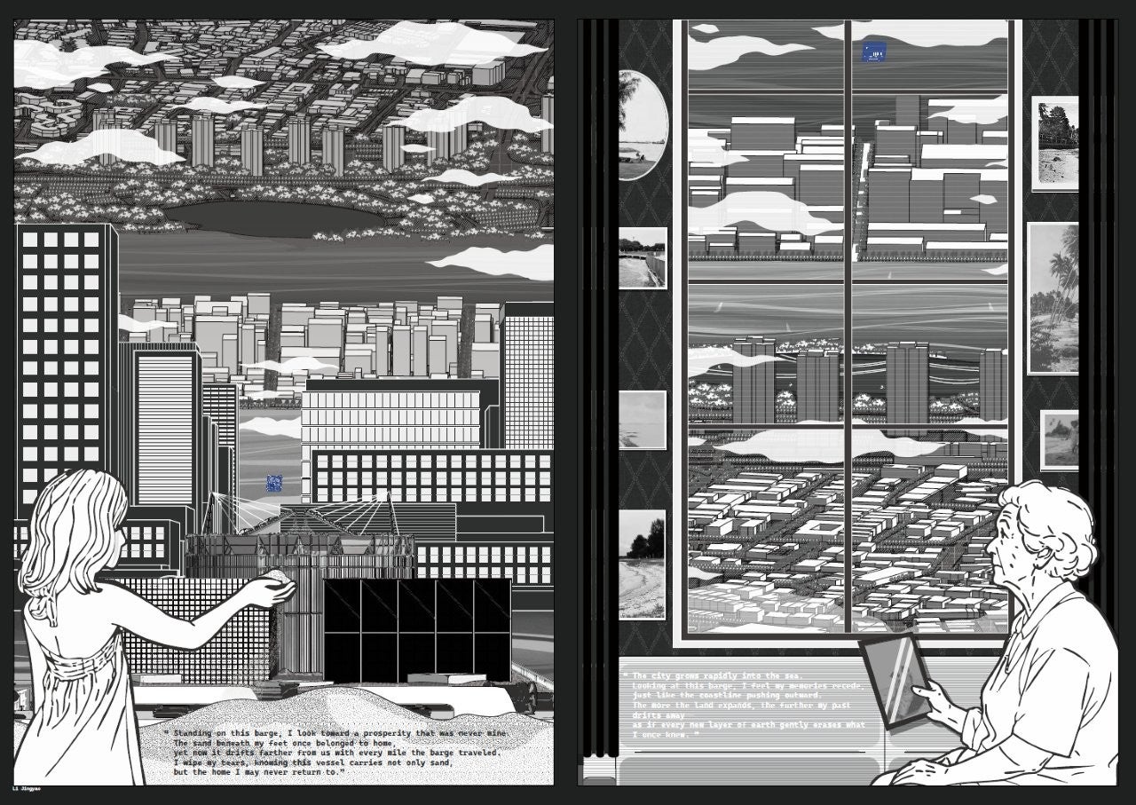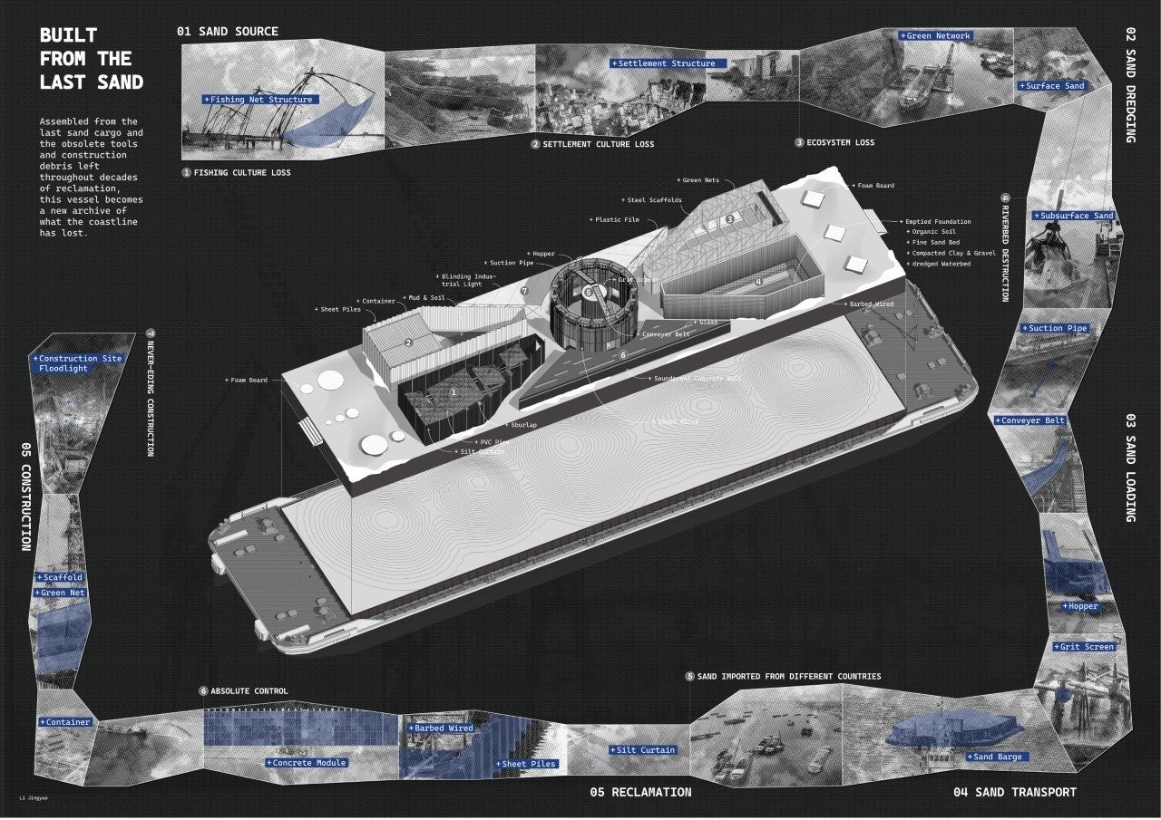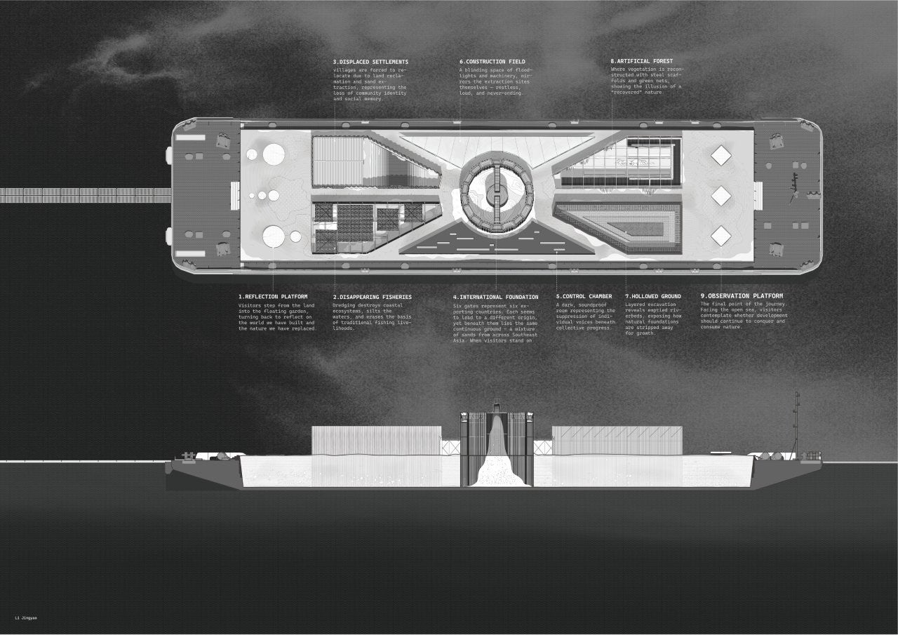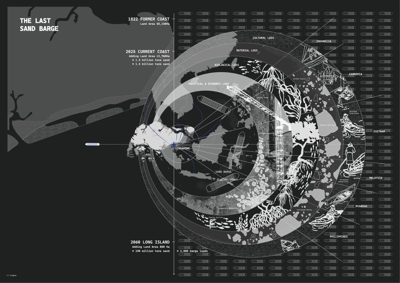The last barge, still laden with the final mixed sediments from Cambodia, Vietnam, Malaysia, Myanmar, Philippines and Indonesia, drifts outside the finished shoreline. There is nowhere to unload. Abandoned at the edge of the nation, it becomes the The Last Sand Barge — a floating vessel of reflection that forces progress to look back at its own foundation.