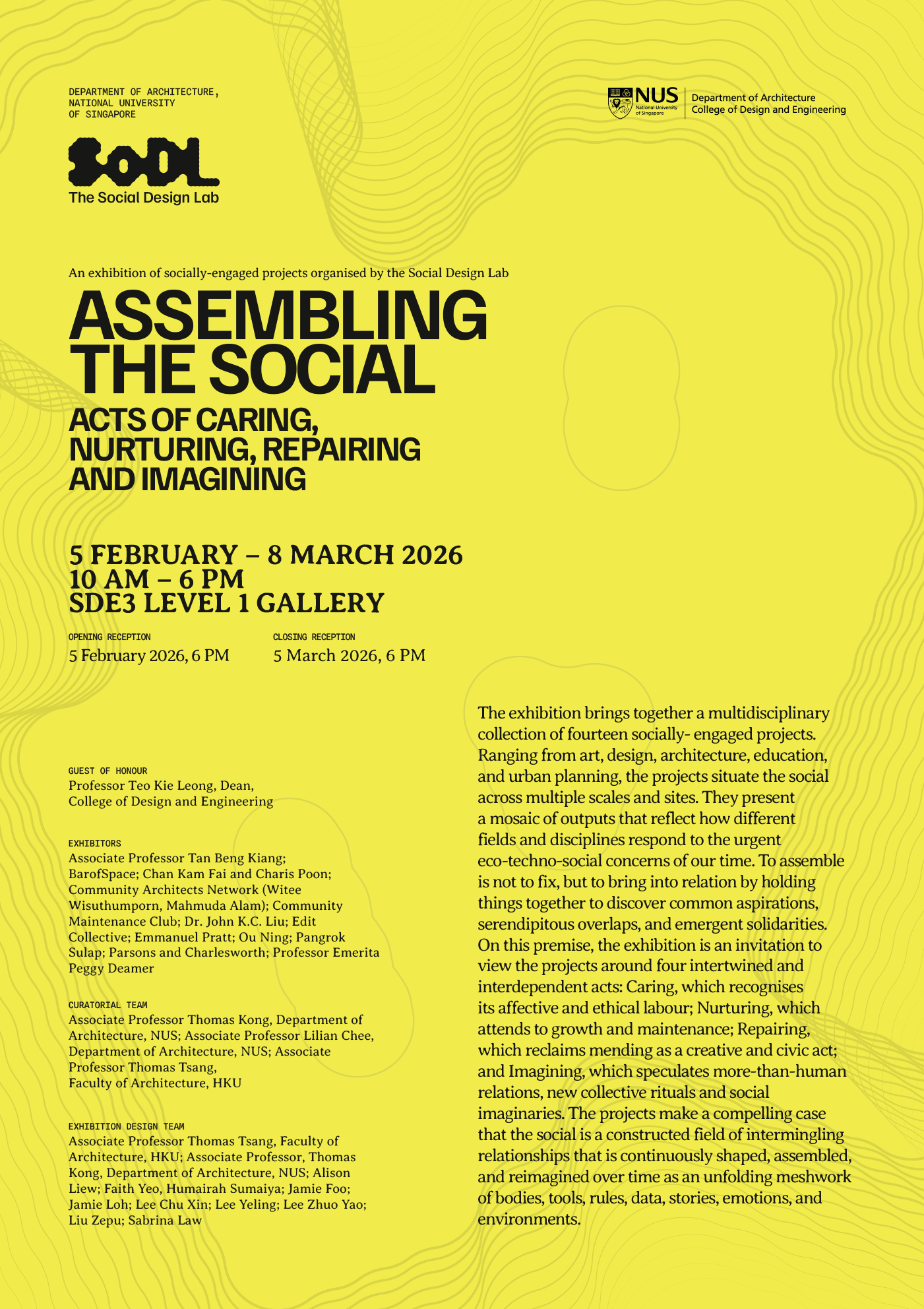 The Social Design Lab (SoDL) at the NUS Department of Architecture (DoA) functions as a mode of inquiry to explore, question, and transform social relations and systems that shape our environments and collective futures. It is an interdisciplinary initiative that connects students and faculty with external communities and practitioners to form a network of socially-engaged design practices. Through workshops, exhibitions, symposiums, research publications, and artist residencies, the Lab fosters inclusive creative design practices across disciplines. We hope to establish the DoA as a leader in design-led socio-spatial innovation on a national, regional, and global scale.