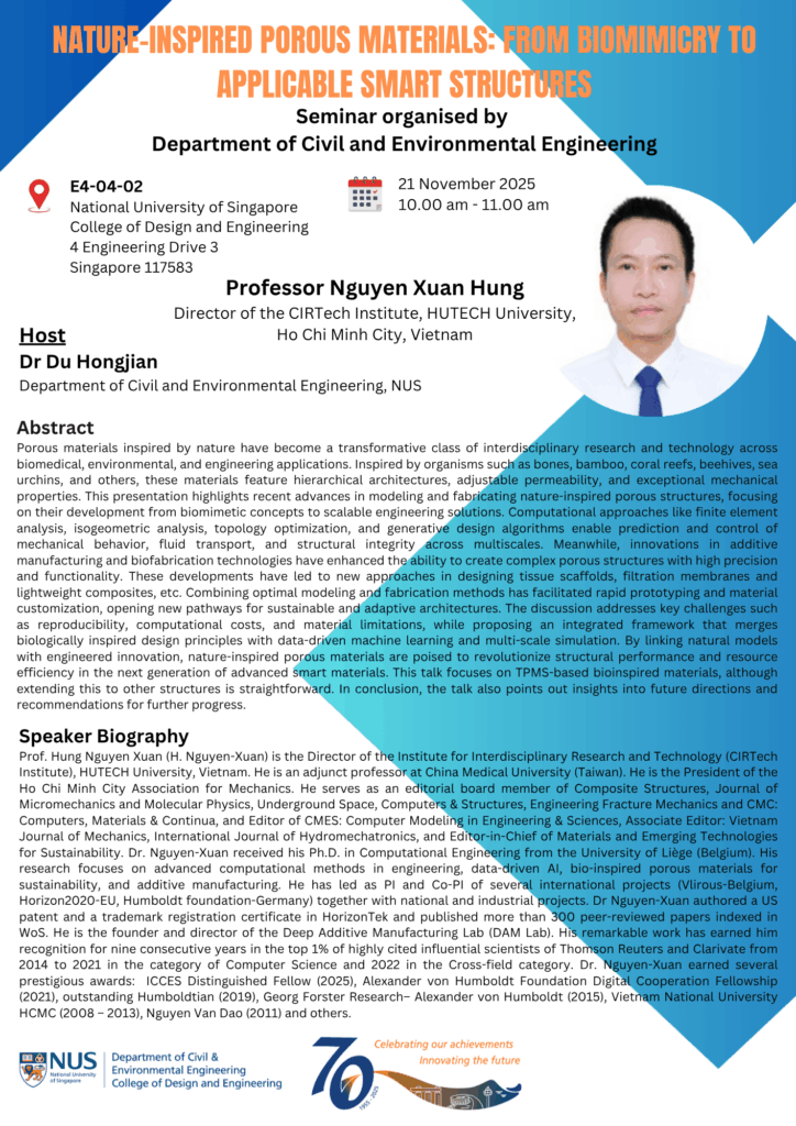 CEE Seminar: Nature-Inspired Porous Materials – From Biomimicry to Applicable Smart Structures Event Details Date & Time 21 November 2025, Friday10:00 AM - 11:00 AM Venue E4-04-02, National University of Singapore College of Design and Engineering 4 Engineering Drive 3. Singapore 117583 Organiser Department of Civil & Environmental Engineering Post navigation ← Previous Event