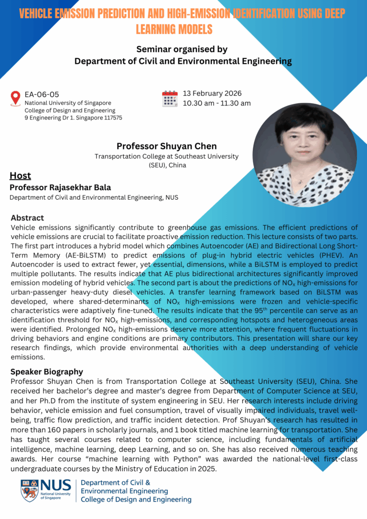 CEE Seminar: Vehicle Emission Prediction and High-Emission Identification Using Deep Learning Models Event Details Date & Time 13 February 2026, Friday10:30 AM - 11:30 AM Venue EA-06-05, National University of Singapore, College of Design and Engineering, 9 Engineering Drive 1, Singapore 117575 Organiser Department of Civil & Environmental Engineering Post navigation ← Previous EventNext Event →