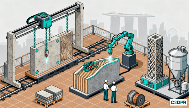 The Centre of Construction 3D Printing Research (C3DPR) drives construction automation, decarbonisation, and digital fabrication in Singapore. It supports research in large-scale 3D printing with concrete, metals, and hybrid systems to boost productivity, performance, and reduce material waste. C3DPR combines expertise in materials science, structural design, testing, and digital fabrication to advance practical and innovative 3D printing solutions, encouraging sustainable technology adoption in the built environment.