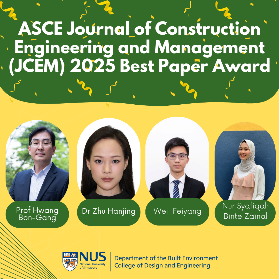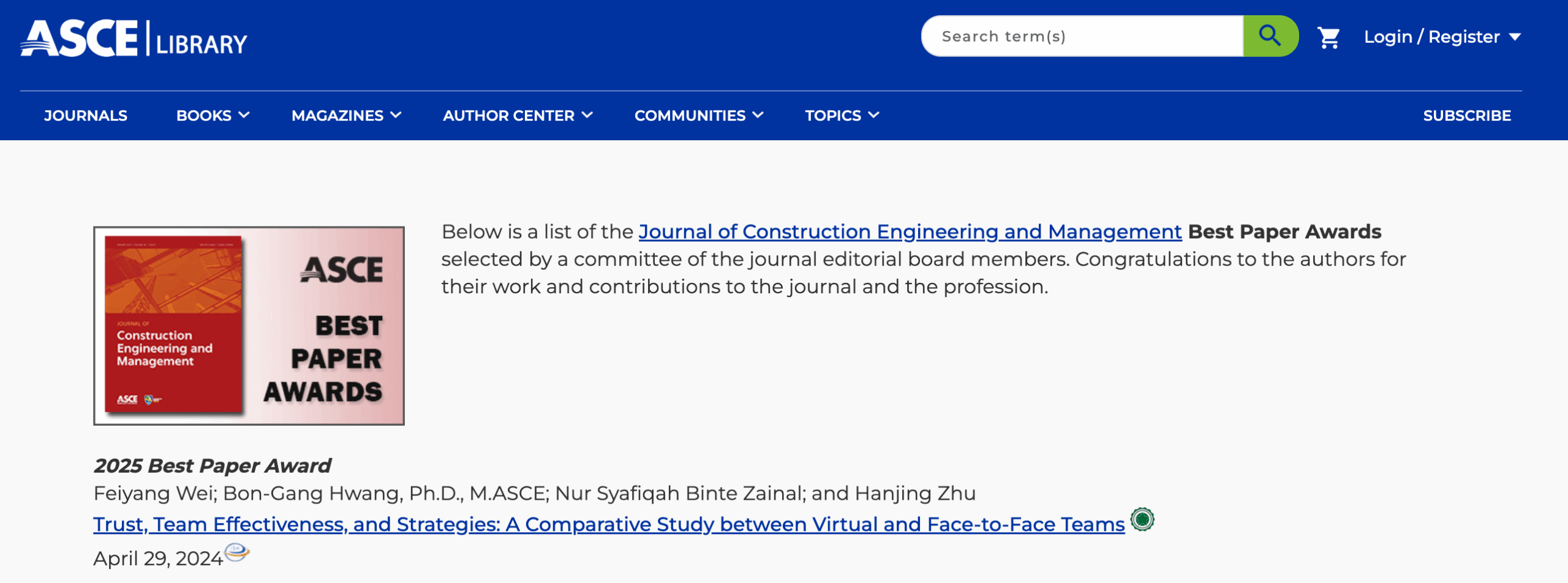 The paper “Trust, Team Effectiveness, and Strategies: A Comparative Study between Virtual and Face-to-Face Teams” by Feiyang Wei, Prof. Bon-Gang Hwang, Nur Syafiqah Binte Zainal, and Dr. Hanjing Zhu, published in the July 2024 issue of the ASCE Journal of Construction Engineering and Management, received the 2025 Best Paper Award.