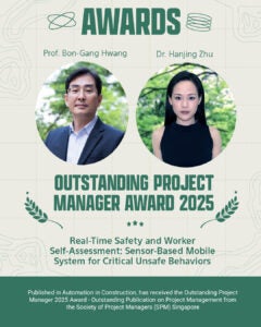 The department is delighted to announce that the paper “Real-Time Safety and Worker Self-Assessment: Sensor-Based Mobile System for Critical Unsafe Behaviours” by Dr Hanjing Zhu and Prof. Bon-Gang Hwang, published in Automation in Construction, has received the Outstanding Project Manager 2025 Award – Outstanding Publication on Project Management from the Society of Project Managers (SPM) Singapore.