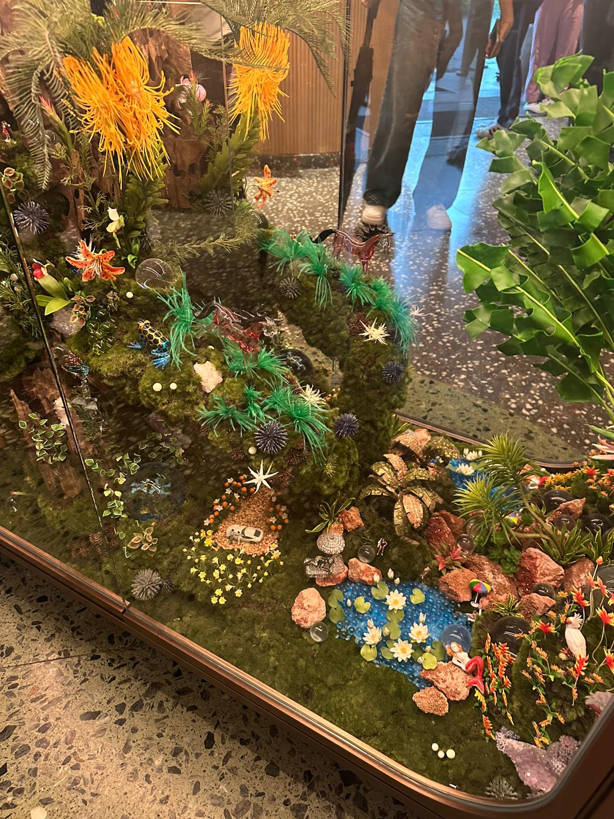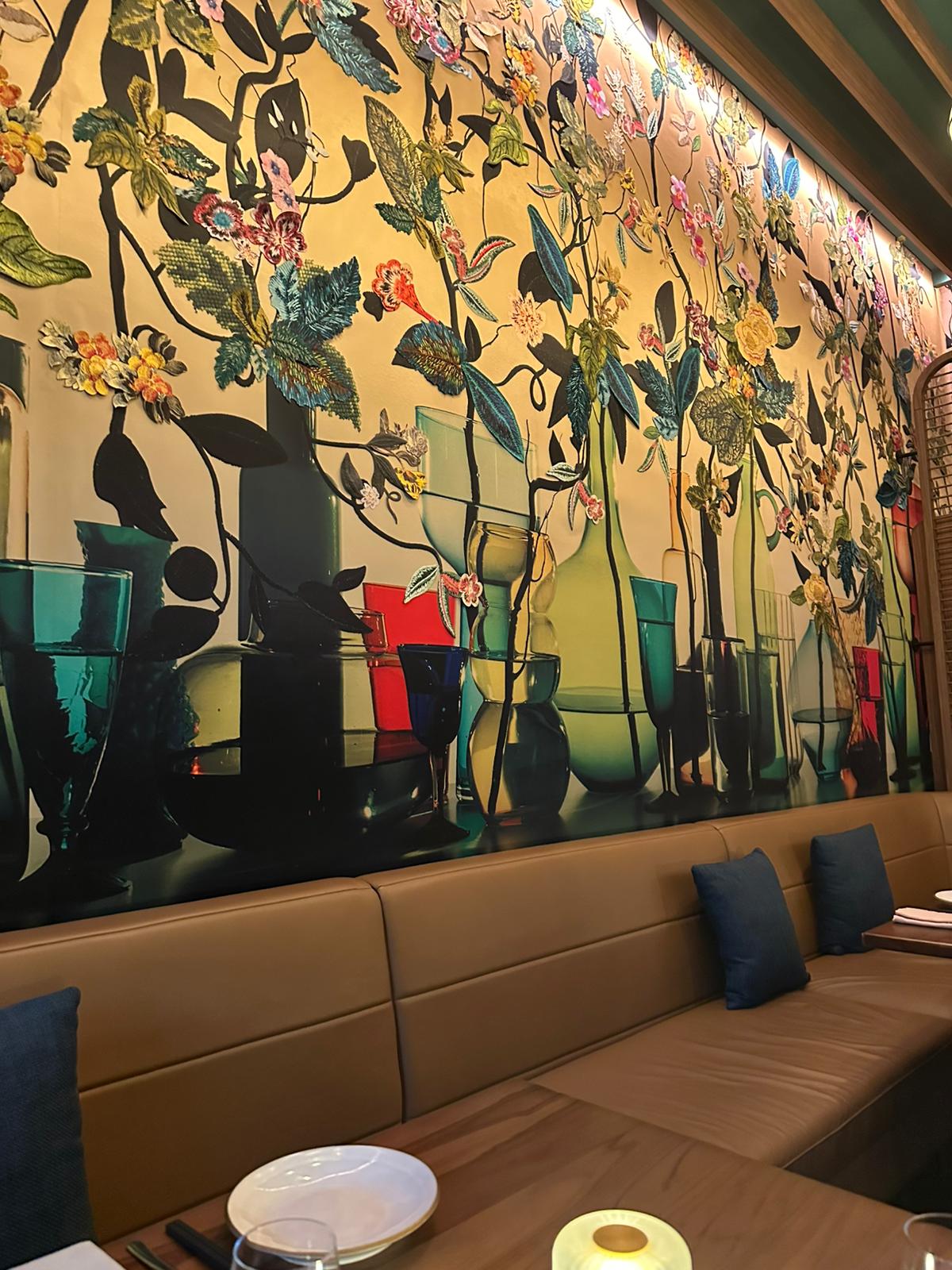 In the restaurant Kaya, The discussion also showcased how tropical influences were thoughtfully woven into the interiors, such as the woven fabric wall design adorned with vibrant floral motifs. The embroidered flowers, handmade from textured fabric that protrudes slightly from the wall, add both dimension and warmth. This detail was carefully calibrated with greater density introduced higher on the wall to preserve longevity, while anticipating that guests may feel drawn to reach out and touch the fabric out of curiosity, turning interaction into an element of design appreciation.