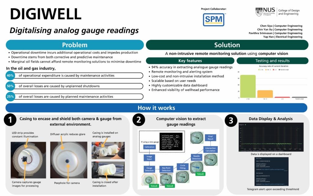 Our solution uses computer vision as it can digitalise readings without modifying existing gauge infrastructure. The camera used in our solution to enable the computer vision is housed in a protective casing that shields it from environmental effects and ensures consistent lighting for accurate readings. Initial tests conducted in a laboratory setting indicate that our solution can extract gauge readings within a 1.6% error at an accuracy rate of 94%.