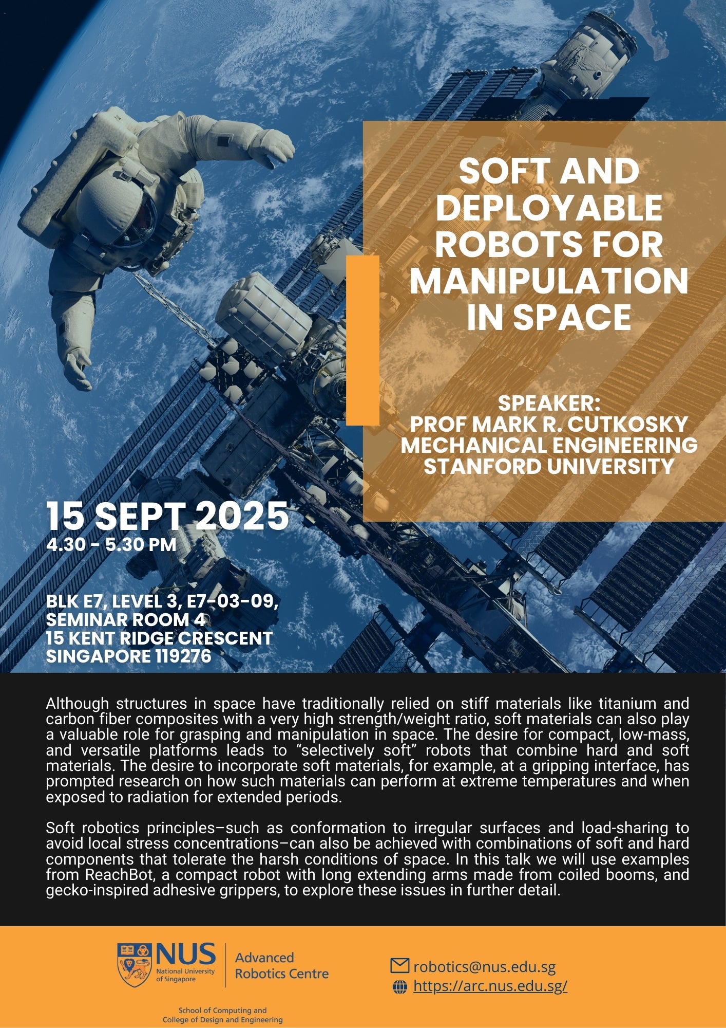 Although structures in space have traditionally relied on stiff materials like titanium and carbon fibre composites with a very high strength/weight ratio, soft materials can also play a valuable role for grasping and manipulation in space. The desire for compact, low-mass, and versatile platforms leads to “selectively soft” robots that combine hard and soft materials. The desire to incorporate soft materials, for example, at a gripping interface, has prompted research on how such materials can perform at extreme temperatures and when exposed to radiation for extended periods. Soft robotics principles–such as conformation to irregular surfaces and load-sharing to avoid local stress concentrations–can also be achieved with combinations of soft and hard components that tolerate the harsh conditions of space. In this talk, we will use examples from ReachBot, a compact robot with long extending arms made from coiled booms, and gecko-inspired adhesive grippers, to explore these issues in further detail.