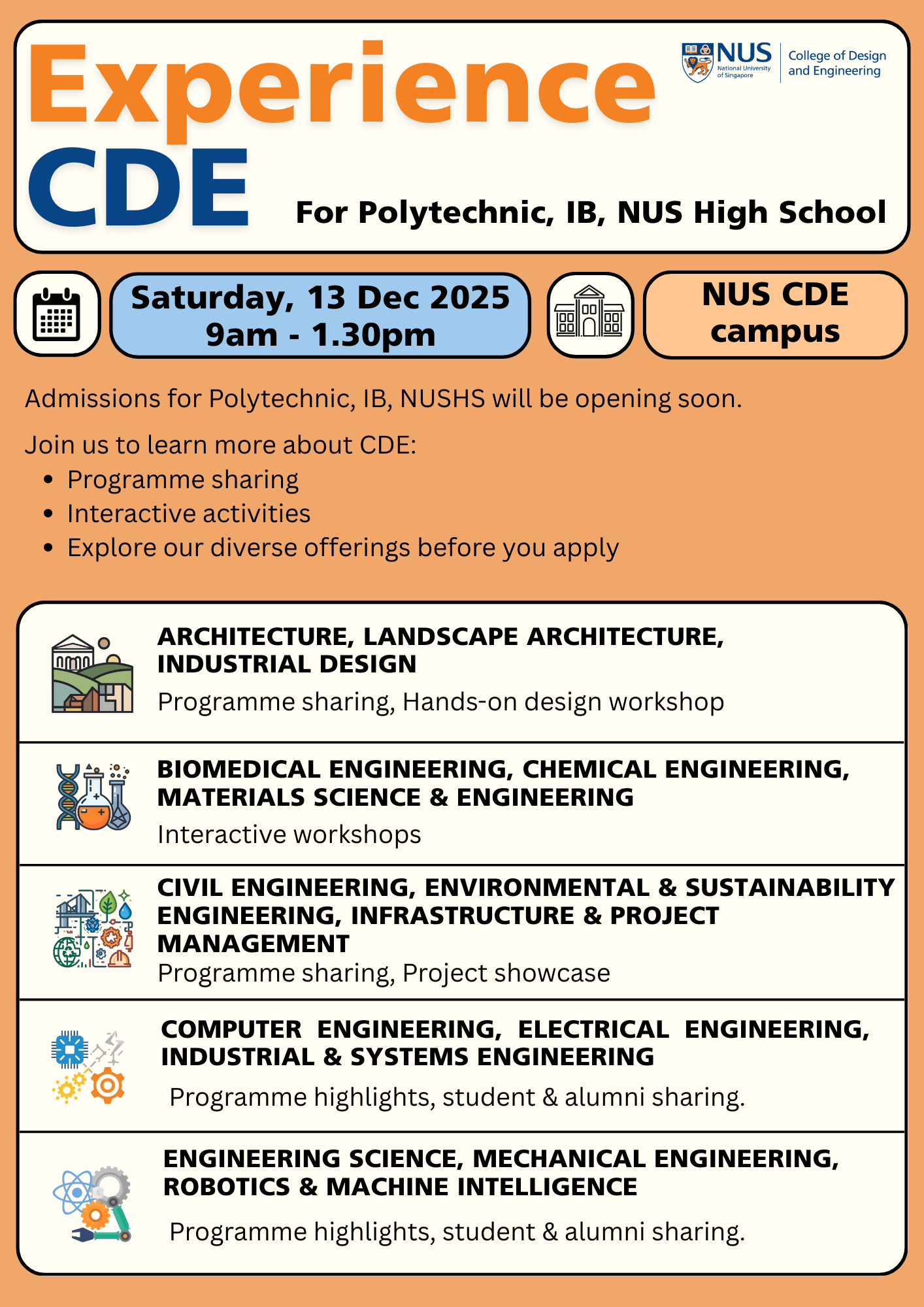 Experience College of Design and Engineering (CDE) 2025 is a half-day event specially curated for Polytechnic, IB, and NUSHS students who are keen to explore and find out more about our 15 undergraduate programmes in CDE.