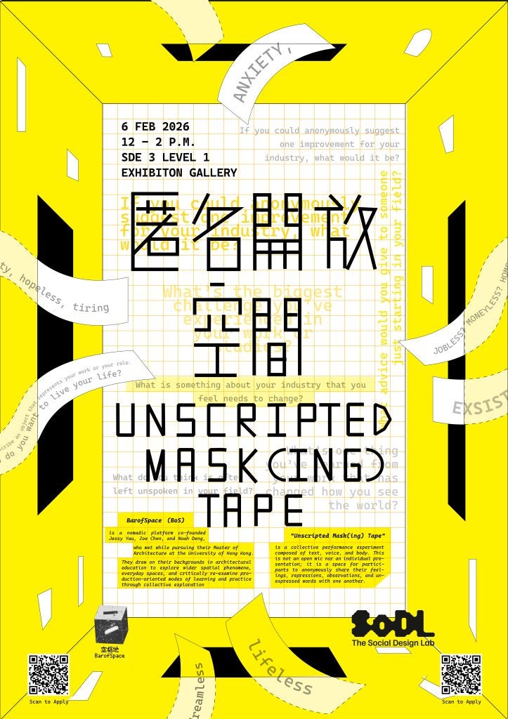 “Unscripted Mask(ing) Tape” is a collective performance experiment composed of text, voice, and body. This is not an open mic nor an individual presentation; it is a space for participants to anonymously share their feelings, repressions, observations, and unexpressed words with one another.