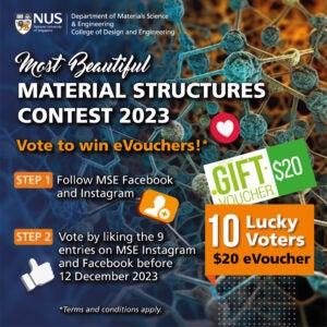 Showcasing the 9 entries by the College of Design and Engineering, NUS ’s Materials Science and Engineering students, “Most Beautiful Material Structures Contest 2023” unveils the microscopic wonders – from leaf stomata to paper, polymer film, and Graphene. Join us in appreciating the beauty and intricacy of these materials’ structures!