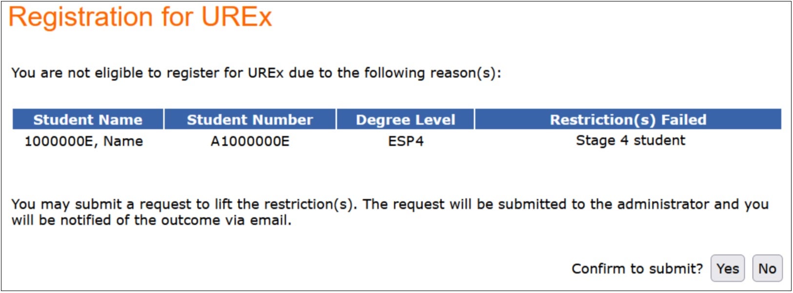 During registration, some students may be prevented by the system from registering. A system generated prompt may appear requesting the student to submit a restriction waiver request (see picture below for example). If the student fulfils the eligibility criteria for UREx, the student is advised to submit the restriction waiver request which will then be auto-directed to their UREx Programme Coordinator. Post-review by the coordinator, you will receive a system generated email informing you if the request has been approved/rejected. If approved, you can proceed to submit your registration request on the Enhancement portal.